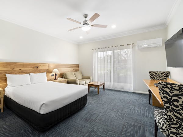 Deluxe Queen with Spa Bath. Rates are for 2 people. Maximum occupancy is 2 people. Bedding configuration is a queen bed. Fully air-conditioned, large bathroom with spa bath, separate shower, Moran sofa for complete comfort, microwave, mini fridge, toaster, kettle, plates and cutlery, tea/coffee, flat-screen TV with free to air channels and FREE wireless internet.